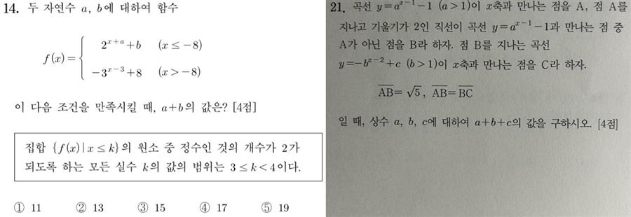 기존 평가원 14번은 난이도가 높은 문항의 자리였는데 이번 9평에선 비교적 쉬운 문항으로 출제되었습니다. 지수 함수에 미지수를 첨가하여 조건을 보고 미지수를 확정 짓는 문항입니다.