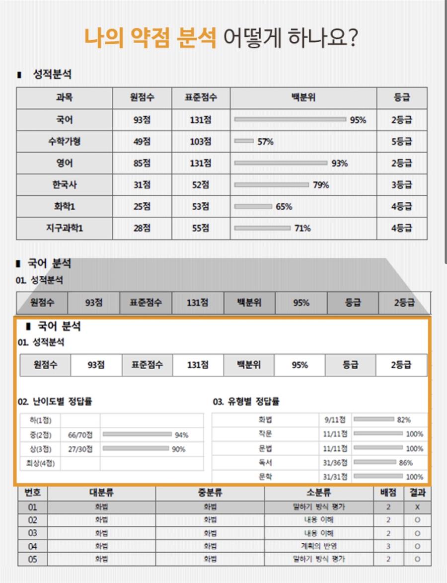 성적을 분석할 때 일반적인 학생들은 보통 점수만을 가지고 이야기하지만, 사실 시험지를 통해 우리는 스스로가 어느 부분에 강점을 갖는지, 어느 부분에 취약한지를 알 수 있습니다.
