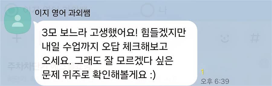 혹시 극복하기 어려울것같은 막막한 취약부분이 있다면 이지수능교육 1:1 맞춤과외의 도움을 받아보는것도 좋을 것 같습니다 :) 3월 모의고사를 망쳤더라도 좌절하지 말고 우리 함께 차근차근 준비해보아요!