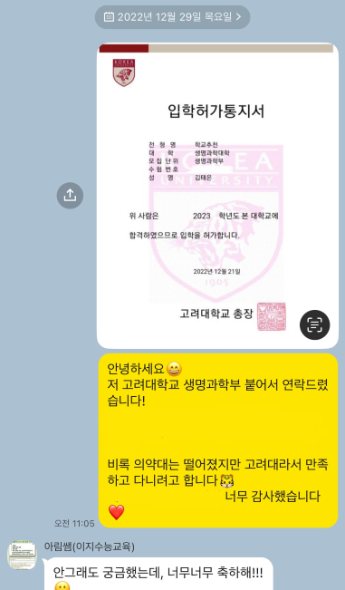 저는 멘탈이 굉장히 약한 사람이라서 수능 채점? 당일에 절대 못했습니다. 그렇게 차일피일 미루다가 한 3일쯤 지났나? 국어 채점하면서 어라라? 수학 채점하면서 어? 영어 채점이 끝나니 영수탐으로 맞추려던 최저가 이미 국영수로 다 끝나있다는 사실에 너무 행복해서 혼자 방에서 채점하다가 거실로 뛰쳐나와서 엉엉 울었던 기억이 있습니다. 그렇게 평화롭게 최저를 맞추고 추합으로 대학에 합격한 뒤, 저의 합격 일등공신인 이지수능교육 선생님들께도 감사 문자를 드리고 고려대뽕에 취해있었습니다!