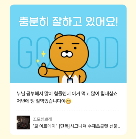 특히, 가족이나 주변 친구들에게 받은 격려와 응원 하나하나가 저를 버티게 해주었습니다. 행복은 큰 일에서만 찾을 수 있는 것이 아닙니다! 밑에 보이는 사진처럼 이런 말들을 힘들 때 듣는 다면, 얼마나 고맙고 힘이 날까요?